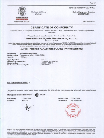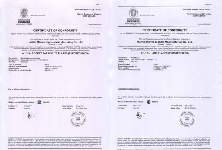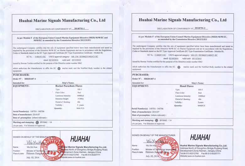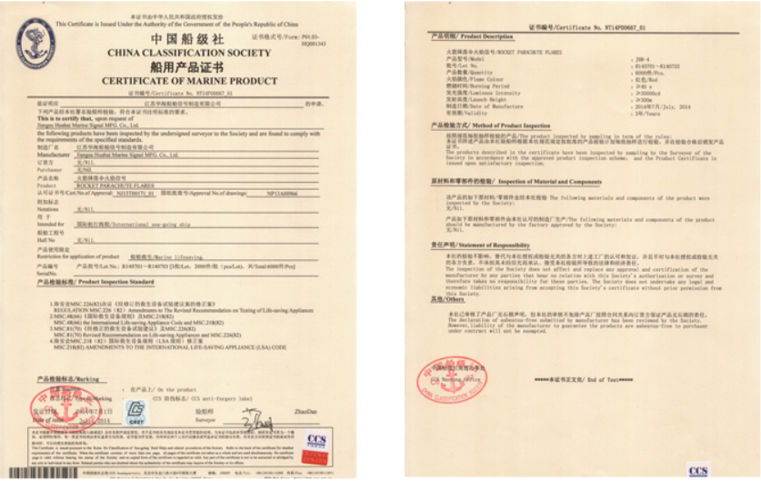 Jiangsu Huahai Ship Signal Manufacturing Co., Ltd. was established in 2009. It is a marine fireworks signal production enterprise formed by the integration of four marine fireworks signal manufacturers in Jiangsu Province, namely the former Haimen Huahai Water Safety Equipment Co., Ltd., the former Dongtai Welfare Fireworks Signal Factory, the former Haimen Jianghai Ship Equipment Co., Ltd., and the former Qidong Highway Traffic Signal Rod Factory. Huahai Company has a good reputation among domestic and foreign customers due to its large scale, strong product professionalism, high quality, excellent service, and good reputation. The company has established a comprehensive quality assurance system and has passed the CCS ISO9001 quality system certification. Its products are strictly developed, tested, produced, and inspected in accordance with the latest international standards such as SOLAS, MSC.48 (66), MSC.81 (70), MSC.200 (80), MSC.218 (82), and MSC.226 (82). The product has been recognized by multiple ship inspection agencies such as China Classification Society (CCS), French Classification Society (BV), and Russian Ship Registry (RS). The product is currently exported to countries such as Japan, South Korea, Singapore, India, Vietnam, Mexico, France, Australia, etc. The company has strong technical capabilities and is committed to the research and development of new products, which have won multiple national patents and technology awards. The company always stands at the forefront of technology in the research and development of life-saving equipment, bringing customers higher quality and safer products.